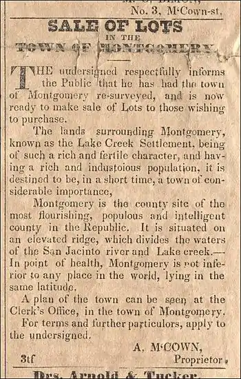 Advertisement for the sale of lots in the Town of Montgomery, Texas, Telegraph and Texas Register newspaper, July 8, 1837, published in Houston, Texas.