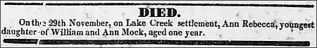 Death notice of Ann Rebecca Mock, Lake Creek Settlement, as reported in Telegraph and Texas Register newspaper, December 17, 1836.