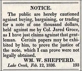 Advertisement by William W. Shepperd, a merchant in Lake Creek during the Texas Revolution. This was published in the March 17, 1836 edition of the Telegraph and Texas Register newspaper, printed at San Felipe de Austin, Texas. (For context, the Battle of the Alamo began on February 23, 1836.)