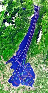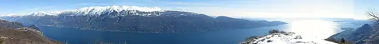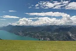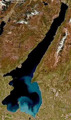 ![]() ![]() ![]() ![]() ![]() ![]() ![]() Clockwise from top: Sentinel-2 satellite image of the lake, View of the lake from Manerba, mountains nearby Limone and shared-use path of Garda, panorama of Sirmione, Castel of Malcesine and panorama of northern-most part of Lake Garda from Nago-Torbole | |