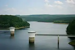 Lake Gileppe is located in Wallonia, in the east of Belgium, near the city of Verviers. There is a 78 m high panoramic tower with a restaurant on the top to look at the lake and the landscape. The water volume is 26,400,000 m³ and the area is 1,3 km².