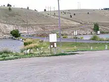 In 1945, a causeway was built to separate the lake from the flooded canyon portion of the old Prickly Pear Creek. The causeway replaced a 1904 combination steel and wood bridge. The steel span was 120' long, and the overall length of the bridge was 520'. The concrete piers of the steel bridge, which was sold for scrap and dismantled in 1952, can still be seen just north of the causeway.