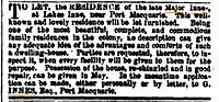 News has been brought into Port Macquarie that late on Saturday the old residence on the Lake Innes Estate, built by Major Innes (convict labour) was burnt to the ground. The police are endeavouring to find out the cause of the fire, but have not yet succeeded. The building was erected soon after Port Macquarie was formed a convict settlement. It has not been inhabited for over twenty-five years, and was little better than a ruin at the time of the fire. The property was owned by Mr. Zions of Sydney.[30]