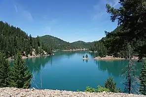 Lake McCloud is a reservoir on the McCloud River in Northern California.[3] The lake forms behind an earthen dam finished in 1965 by the Pacific Gas and Electric Company to control water flows and for generating hydro-electric power.[1] McCloud Dam (National ID # CA00416) is 235 feet (72 m) high, 630 feet (190 m) long at its crest, and impounds a maximum capacity of 35,200 acre-feet (43,400,000 m3).[4]