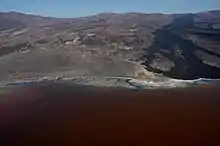Volcanism occurred in the area of Lake Suguta when it existed, resulting in the formation of pillow lavas and phreatomagmatic activity,[7] lava flows of Emuruangogolak volcano reached the lake on its southern margin 11,000 - 9,000 years before present,[10] and a layer of tephra was deposited in parts of the lake 8,770 years before present.[11] A number of cinder cones have been modified by Lake Suguta,[7] and the increased availability of water allowed the onset of fumarolic activity at volcanoes today too dry to support fumaroles, such as on The Barrier where fumarole sinter was emplaced when Lake Suguta existed.[12]