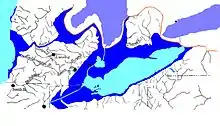 The strip of Lake bottom between the Whittlesey and Warren beaches in southeastern Michigan is largely a clayey plain, the principal exceptions being at deltas of Lake Arkona. The deltas of streams entering Lake Whittlesey are less conspicuous than of the same streams in connection with its predecessor, Lake Arkona. One reason for this is the fact that the rise of water caused estuarine conditions for some distance up the valleys beyond the Whittlesey beach, and it was necessary to fill these estuaries from their heads down-stream past the beach before the lake-bed proper would receive a coating of delta material.[1] Frank Taylor named this body of water, Lake Whittlesey in 1897, in honour of Charles Whittlesey.[2] The lake created the Belmore beach of the Erie-Huron basin. It flowed across the "thumb" of Michigan, through an outlet known as the Ubly outlet.[3]
