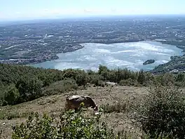 Lake Pusiano (also called lacus pusianum) is written for the first time in an official way in a document dating back to 1314, which regularizes the division of the basin by deed: 2/3 become the responsibility of the archbishop of Milan and his canteen for the needy, 1/3 remains of the collegiate church of San Giovanni Battista of Monza.[1]