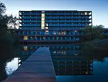 The new building was designed by Ferguson Mann Architects[21] who created apartment spaces with extra high ceilings, full height glazing, under floor heating and balconies. Other features include an apple orchard, wild flower meadows, country walks, a fishing club, bird and bat boxes, picnic and barbecue areas, a pontoon, table tennis, parking and allotments. There are 422 homes including studios, 1 and 2 bedroom apartments. 270 apartments are within the existing building, 127 in the Cor-Ten structure, 143 below the podium and 16 in the east wing of the existing building and 136 in the new. There are also 360 car parking spaces. 36 apartments were built for Housing Association, Aster Homes are located in the Cor-Ten phase of the existing building.