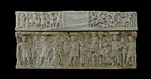 A second room is dedicated to the Roman and early Christian period. A statue of the emperor Trajan (who promoted the town to the coveted statute of Roman colony between 98 and 117 CE)[4] and some mosaics from the nearby archeological site of Uzita (a mosaic of the seasons, a mosaic of Venus "anadyomene", i.e. rising from the sea, surrounded by cupids) stand out among the various sculptures and honorary plaques of funerary inscriptions. The piece which particularly stands out is an exceptional sculpted Christian marble sarcophagus, where the deceased, portrayed in his rich landowning context - with a hunting party, his horse, his dog, servants and friends as well as his wife waiting for him at home - comes to the time of death, in front of Christ seated on the throne, surrounded by the apostles Peter and Paul, and transitions to the afterlife where his friends (with local names of non-Roman origin) have preceded him.[5][6]