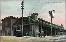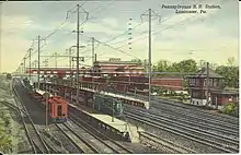 The legislature revised its plan to include the failed attempt with a connection from the canal terminus in Columbia to Philadelphia. Engineers recommended that a rail routethe Philadelphia and Columbia Railroadbe constructed with an inclined plane at either end.[18] The original route of the railroad was to pass north of Lancaster, but the city petitioned the state to alter it so that the railroad passed through downtown Lancaster.[19] The Philadelphia and Columbia Railroad opened in 1834, originally with a horse-drawn passenger cars before steam locomotives replaced them as motive power.[20] There are no photographs of the early Lancaster station, however the station would have most likely consisted of nothing more than an open-air, elevated platform, as was customary for train stations of that period.[21] The station was located at North Queen and East Chestnut Street, with the platform possibly extending the length of the lot between Queen and Christian Streets.[21]