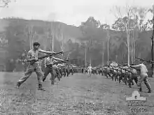 The training centre draws its lineage from the Jungle Training Centre that was formed in November 1942 in response to the requirement to train troops for jungle combat in the South West Pacific Area during World War II.[2] Under the command of Colonel Alex MacDonald, who had previously commanded the Darwin Mobile Force,[2] the centre grew out of the Guerilla Warfare School that had been established earlier at Foster, Victoria.[3] Located in the Gold Coast hinterland below the Beechmont plateau that stretches towards Tamborine Mountain, the establishment was located amidst thick rainforest and steep, razor-back country.[4] Staffed by instructors that had experienced combat – mostly in the Middle East, initially, but then in New Guinea as the war progressed[5] – upon creation the centre consisted of a number of detachments including the Reinforcement Training Centre, the Independent Company Training Centre and the Tactical School. As the demand for specialised jungle warfare training grew with Australia's increased involvement in the Pacific, the centre was expanded until it consisted of about 2,000 trainees organised into eight training companies; each week a total of 500 personnel marched out to join the infantry battalions fighting in the New Guinea campaign having completed a four-week course. In addition, the Commando Training Battalion was formed to provide reinforcements for the Australian commando units, while an officer training wing focused upon delivering specialised platoon-level training for officers over the course of a six-week program.[2] After May 1943, the centre began to contract as its need declined, although it continued to train large numbers of soldiers under experienced senior instructors such as Major Harry Harcourt.[6] It was finally disbanded in 1946 following the conclusion of hostilities.[2]