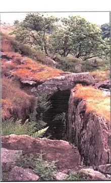 The 'Parish' road was built in 1810 and the Druids Graves cairn was robbed for stone to build it.[36] On 30 December 1767 the Turnpike Committee looked at the road from Beith to Coldstreem (sic) Bridge. They felt it was not suitable for upgrading and that a new line would be both easier and shorter. The old road went over the hill between the Park Dykes of Overtoun and Cuff via Threepwood.[37]