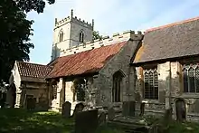 The present village dates from a rebuilding in the 18th century, the original medieval village now only earthworks in fields to the West. Langford Old Hall is a stone building of the 17th century. Langford Hall is a brick building built between 1780 and 1790 for the Duncombe family, built by John Carr.[15] The parish church of St Bartholomew is to the north of the village.[16]