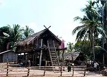 The houses are built on wooden or bamboo piles between one and two metres (6') above the ground and are at least five by seven metres (16' x 23') in size. Usually they are larger. Construction materials include woven bamboo or sawn lumber for floors and walls and grass thatch or bamboo shingle roofing. A kitchen hearth is located inside the house, and an open porch is built on at least one end of the house. A separate rice barn, also built on piles, may be located in the village near the house (Kammu) or on the edge of the village (Lamet). Villages are commonly built near a small stream to provide drinking and washing water, which is often diverted through a bamboo aqueduct to facilitate filling buckets and bathing.[3]