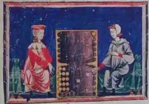 Laquet is described in the Libro de los Juegos, a game book written for King Alfonso of Castile between 1251 and 1283. It was described as being a "new game". It shares with the much later French game of Jacquet the ludeme, unusual for games of the tables family that an isolated hostile man may not be 'hit'.[lower-alpha 1] It may therefore be ancestral to Jacquet.[1] Golladay translates the name of the game as "Quest."[2]
