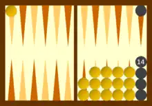 The game was played on a tables board of 24 points (such as a Backgammon board) using 30 pieces or 'men' of two different colours, two dice and two dice cups.[1]