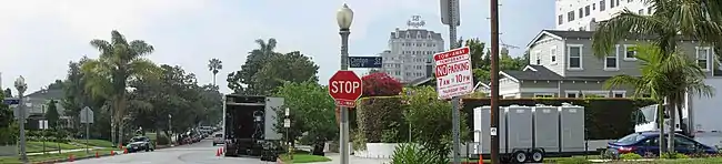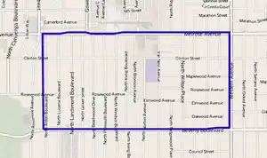 According to the Greater Wilshire Neighborhood Council and the Larchmont Village Neighborhood Association, Larchmont's boundaries are Melrose Avenue on the north, Wilton Place on the east, Beverly Boulevard on the south, and Arden Boulevard on the west.[1][2][3] Adjacent neighborhoods are Hollywood to the north, Wilshire Center to the east, Windsor Square to the south, and Hancock Park to the west.[4]