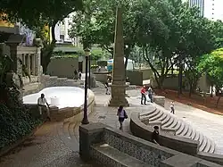 With a neocolonial style, the project enhanced the obelisk, introduced a new fountain (in a tank also called "vasca"),[5] a portico with tiles, staircases and circular benches also called exedras. In 1922, the Ladeira da Memória Street became the first public place where the city coat of arms of São Paulo appeared.[11] The tiles of the work with the city coat of arms (chosen in a public contest won by Guilherme de Almeida and Wasth Rodrigues in 1917) were produced in England and painted and re-baked in Brazil in the first Brazilian factory to produce fine faience, a type of ceramic used in dishes such as cups, plates, and others. Located in Santa Catarina, the factory was owned by Ranzini, an Italian ceramist.[5] The representations on the tile confirm what the square is: Memoria (Memory). The square was protected by the municipality in the early 1970s (Z8-200-083).[3] Moreover, the landscaping project kept the fig tree in the same place,[8] with the support of councilman Amaral Gurgel, who exposed, in the Municipal Chamber of São Paulo (Câmara Municipal de São Paulo - CMSP), his concern about the care given to the trees in the place.[11]The fig tree only had some branches cut off during the construction of the Anhangabaú Station, in the 1970s, a few meters below.[8] The construction of the accesses to the subway station and the installation of the bus terminal at Bandeira Square, in the late 1960s, significantly altered the surroundings of the square.[7]