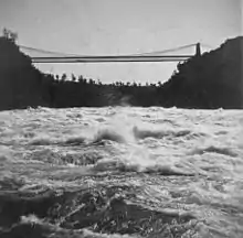 In early November 1886, he set his sights on Niagara Falls, apparently without immediate financial incentive, but with the hope of future returns.[22] He visited Niagara Falls to find a site to jump from, rejecting the "old bridge" at Falls View, a wood and steel suspension bridge[23] just below the rapids, before settling on the new Niagara Falls Suspension Bridge. This double-decker rail and carriage bridge was completed earlier that year, completely replacing an earlier suspension bridge on the same site, with minimal traffic disruption,[24] only to be itself replaced ten years later. That bridge had only seen one previous jump, by a Bellini in 1873, who performed a sort of bungee jump.[22]