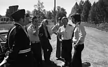 Medially Svartenbrandt became first known in connection with the spectacular mass escape from the Kumla Prison in August 1972.[4] He had managed to hide in a saucepan cupboard in the security department and the guards had not noticed that he was missing when they locked up the prisoners for the night. Svartenbrandt crawled out of his cupboard after a few hours and unlocked his fellow prisoners' cell doors using counterfeit keys.[10] The escapers included Lars-Inge Svartenbrandt, Bosse Dynamit, Nisse Pistol, Kalle Kanon and the Yugoslav Embassy murderers Miro Barešić and Anđelko Brajković.[11][12] Together with 15 other hard-hit interns, including terrorist Miro Barešic, he climbed over the "fugitive walls" from what which was called Europe's safest prison, and disappeared.[13] Svartenbrandt was arrested a week later in Lindesberg.[11] The following year, in June 1973, he escaped along with three other prisoners in a garbage truck. Svartenbrandt and Nisse Pistol and two other companions jumped over the fence and hijacked the garbage truck by threatening the driver with a weapon they came across. They rammed the prison gate and disappeared.[14] After two months on the run, Svartenbrandt was captured in Rörsås, south of Mariestad.[15] Svartenbrandt was granted leave in October 1979 from Hall Prison to visit a doctor in Uppsala. Instead he freed his friend Benny Lilja who along with other prisoners had gone to the bathhouse in Södertälje. Svartenbrandt was waiting outside the bath house in a black Jaguar and Lilja got into the car and the two drove off.[10]
