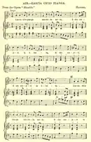 and a tempo marking of Largo.[lower-alpha 1] In the first edition published by John Walsh, the orchestration is unspecified,[4] giving only a solo melody line above an unfigured bass line. There is the mention 'violins' at bar 23 where the singer breaks (bar 31 in most modern editions which include an 8-bar introduction). Chrysander claimed[5] to have worked from Handel's 'performance score' and stated that the autograph manuscript had been lost (although RISM state that the British Library hold a fragment of the autograph missing 53 bars);[6] Chrysander's edition shows two violins and a viola with a cello. He does not provide figuring for the continuo. It is not clear whether he invented the additional string parts himself (as he often did) or found them in the performance score to which he referred. Most modern editions seem to be based upon Chrysander's version, as can be seen from the different placement of certain syllables in the melismata in his version and in the Walsh first edition.