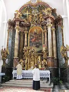 The Last Gospel began as a private devotional practice on the priest's part, known well in the Sarum Rite in Catholic England, but was gradually absorbed into the rubrics of the Mass.[2] Immediately after the blessing, the priest goes to the Gospel side (i.e., to his left) of the altar, beginning with the Dominus vobiscum as is usual at the Proclamation of the Gospel within the Mass. However, as the priest reads from an altar card, he traces a Sign of the Cross with his right thumb on the altar's surface instead of the Gospel text, before signing his own forehead, lips, and chest. At the words "Et Verbum caro factum est" ("And the Word became flesh"), the priest (and, if present, servers and the congregation) genuflects.