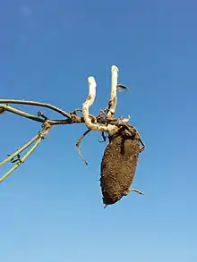 The delicious taste of the tubers is widely reported.[15][3] The tuber contains 16-20 % starch, 5% sugar and 10-12 % protein.[16] Proteins consist of the amino acids glutamine, arginine and asparagine. Furthermore, α-amino-8-oxaly-amino-butyric acid and lathyrogenic substances could be found in the plant.[5] Vitamin C contents of 161.25 mg/100 g in the aboveground biomass were observed.[11] That amount of ascorbic acid is approximately twice as high as the reference daily intake and three times higher than the vitamin C content of lemons. Calcium amounts are almost twice as high as in cow milk.
