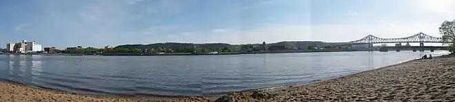In 1887 a wooden bridge crossing the Mississippi over Latsch Island was created to join Winona to Wisconsin.[9] In 1890 Congress authorised Winona to construct a new bridge over the Mississippi; the result was that in 1892 the Chicago Bridge and Iron Company created the steel and iron "Wagon Bridge" which spanned over the river and the island into Winona's main street.[10] In 1917 the old wooden bridge was replaced by a concrete bridge.[9]