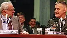 In his first two weeks in the Senate, Faircloth was appointed to serve on the Senate Environment and Public Works Committee, the Senate Banking Committee, and the Senate Armed Service Committee.[32] While on the Armed Service Committee, he opposed the inclusion of homosexuals in the U.S. military, claiming the number of AIDS-infected people in the military would increase.[33] He opposed the Clinton administration's "don't ask, don't tell" policy and said it was a result of President Bill Clinton's lack of military experience.[34] That remark was condemned by Colin Powell, the chairman of the Joint Chiefs of Staff, who said that, "it is unfair to single out the president in this regard".[34]