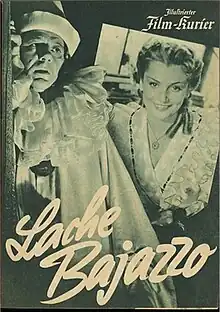 Laugh, Bajazzo (German: Lache Bajazzo) is a 1943 German drama film directed by Leopold Hainisch and starring Paul Hörbiger, Claude Farell and Dagny Servaes. A separate Italian-language version Laugh, Pagliacci was also produced.[1] The film's sets were designed by the art director Franz Koehn and Hans Kuhnert.