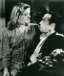 Bacall was cast with Bogart in two more films. In the film noir Dark Passage (1947), she played an enigmatic San Francisco artist. Bosley Crowther of The New York Times wrote: "Miss Bacall ... generates quite a lot of pressure as a sharp-eyed, knows-what-she-wants girl."[39] Bacall appeared in John Huston's melodramatic suspense film Key Largo (1948) with Bogart, Edward G. Robinson and Lionel Barrymore. In the film, according to film critic Jessica Kiang, "Bacall brings an edge of ambivalence and independence to the role that makes her character much more interesting than was written."[40]
