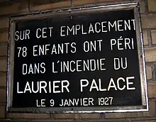 The Laurier Palace Theatre fire, sometimes known as the Saddest fire or the Laurier Palace Theatre crush, occurred in a movie theatre in Montreal, Quebec, on January 9, 1927, killing 78 people.[1][2] The theatre was located at 3215 Saint Catherine Street East, just east of Dézéry St.