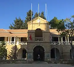 The site of the building was historically occupied by the Lusignan Palace, the former residence of the Frankish kings of Cyprus in the Middle Ages. The British colonial administration considered this building too weak and ruinous and decided to demolish it.[1] The historical gate of the palace wanted to be kept, but it was technically impossible to do so and the gate was moved to the present-day Lapidary Museum. Thus, plans made by Frank Cartwright, George Jeffery and William Williams in 1896 that kept the gate were discarded. The present-day law courts building was designed in 1899 by Charles Bellamy, the Director of Public Works. The construction began on 14 June 1900 and was completed in 1904, when the law courts, postal service, land registry office and police moved in. However, by the 1920s, the building was too small for the needs of the administration and new blocks were added to the east and west of the central building. [2] The building was renovated, part by part, between 1998 and 2009.[1]