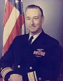 Lawrence George Bernard (February 9, 1914 – March 29, 1997), was a submarine commander during World War II who reached the rank of rear admiral in the United States Navy.[6] Ensign Bernard graduated from the United States Naval Academy in 1937. In 1939 he was instructed in submarine warfare at New London, and in February 1940 was assigned to the USS S-39 (SS-144) as the boat's communication officer and later as the executive officer. Bernard was awarded the Silver Star and the Bronze Star Medal for his actions in these positions.[7] In May 1944, Lieutenant Commander Bernard took command of the USS R-2 (SS-79), which was attached to the Fleet Sonar School in Key West, Florida. In July 1945 Bernard was promoted to the rank of commander and took command of the USS Stickleback (SS-415) in October of that year. Admiral Bernard took command of the search for USS Scorpion (SSN-589) on May 29, after she went missing May 22, 1968.[8]