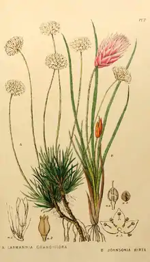- ↑ from A sketch of the vegetation of the Swan River Colony by John Lindley. The plants depicted are Laxmannia grandiflora and Johnsonia hirta (now Johnsonia pubescens).