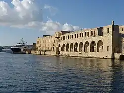 The Lazzaretto consists of a complex of buildings dating back to the 17th to 19th centuries. Nothing remains of the original 16th century temporary structure, and the oldest extant building within the complex is that built in 1643 during the magistracy of Grand Master Lascaris. This structure, which is known as the Palazzo Vecchio (Old Palace), the Palazzo Grande (Great Palace) or simply il-Palazz (the Palace), is two stories high and consists of eight halls built around a central courtyard. This building had a number of coats of arms on its façade, but these were defaced probably during the French occupation of Malta. The building also has two marble inscriptions, one undated and another dated 1787, while a third inscription dated 1797 was removed in the late 1960s. A copy of marble inscription dated 1814 is also affixed on the western façade of the building. The original inscription was affixed on a gallows in front of Fort Manoel, and it is now in storage in Valletta.[1]