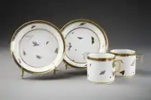 Before they began making porcelain, the Antonibons already enjoyed water rights enabling them to build grinding-mills,[20] a ban (shared by other manufacturers) on their workers joining competitors without a four-year break,[21] and from 1756 a monopoly on the manufacture of maiolica within five miles of Nove, affecting at least one rival in nearby Rivarotta.[22] However, the Antonibons attempts to get a monopoly on the use of moulds were never successful.[23] A local competitor complained of Pasquale Antonibon's "haughty and fierce nature" and the "authority and diligence" he used to get his way.[24] In 1773 the various privileges were renewed, except for the maiolica monopoly, which changing Venetian policy now deprecated.[25] In 1778 new porcelain factories in the republic's territories were banned, to protect the existing three manufacturers, Cozzi, Le Nove and a factory in Este, Veneto.[26] After a further renewal in 1793, all privileges were revoked at the end of 1794 under a new policy.[27]