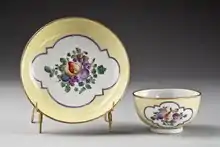 The Venetian government archives include extensive collections of petitions, complaints and reports throughout the 18th century documenting these efforts by the Antonibons and other owners, and some allegations of sabotage at the factories, enticing away of workers, and the theft of moulds.[17] According to some scholars,[18] the samples of supposed "Le Nove porcelain" sent by Antonibon to the Venetian government supporting a licence application in 1758 may actually have been made by the long-closed Vezzi porcelain factory in the 1720s, with painted decoration recently added in Nove.[19]