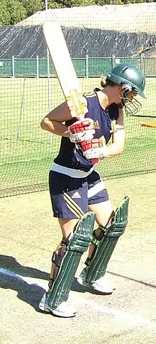 Poulton was selected for the 2010 World Twenty20 in the West Indies and played in every match. With the selection of Elyse Villani to open with Nitschke, Poulton batted at No. 3 in all but one match.[44][45][46][47][48][49][50] In the first warm-up match, she scored one from six balls before being dismissed by Sian Ruck as Australia lost to New Zealand by 18 runs.[44] In the last warm-up match, she hammered 44 from 21 balls including two sixes and then took a catch to remove Armaan Khan as Australians made 5/166 and defeated Pakistan by 82 runs.[45]