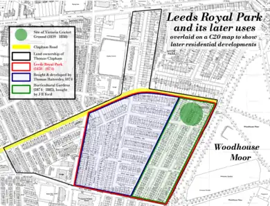 Once the Royal Park had been put up for sale in 1871, Clapham remained as its manager for a time, a period in which he got into more legal trouble for allowing betting on games of knurr and spell on the property.[13] The Royal Park itself, which was not offered as a going concern, was finally sold in February 1874 for £16,500, after sale attempts in 1872 and 1873.[10] The lots were described at the time as: "They are situated about one mile from the centre of Leeds in the best locality, and the land unbuilt on is admirably adapted for the sites of residences of a superior class. A very extensive and beautiful view can be obtained from nearly every part of the estate."[14]