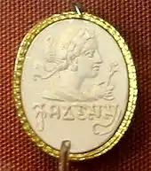 A Greco-Roman-style carnelian seal from the Punjab region, with Brahmi inscription "Kusumadasasya" ("Flower-Servant"). 4–5th century CE. British Museum.