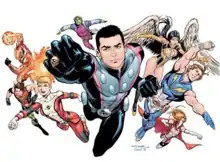 This version of the Legion next appeared in the 2008 Final Crisis: Legion of 3 Worlds limited series, written by Johns and drawn by George Pérez. The mini-series features the post-Infinite Crisis Legion and Superman teaming up with the "Reboot" and "Threeboot" incarnations of the Legion to fight Superboy-Prime, the Legion of Super-Villains, and the Time Trapper.[43] It was revealed in the mini-series that the "Reboot" Legion came from Earth-247 (a metafictional homage to the Legion's first appearance in Adventure Comics #247), which was destroyed in Infinite Crisis, and the "Threeboot" Legion came from the reconstructed Earth-Prime. Johns stated that the intent of the mini-series was to validate the existence of all three versions of the team while simultaneously restoring the pre-Crisis Legion's continuity.[43] The incorporation of the three teams into mainstream DC continuity was shown in Action Comics #864 (June 2008). In the story, Batman recounts the Justice League of America and Justice Society of America's battle alongside the original Legion to defeat Mordru,[44][45] the "Reboot" team's assistance in destroying a Sun-Eater in the 20th century,[46] and his own recent encounter with the "Threeboot" team.[47]