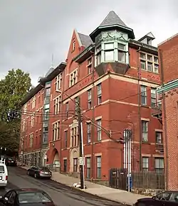 The main elevation features two copper bay windows at the corners, one three stories tall and the other one story tall.[2] The former office building now houses apartments.