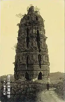 On September 25, 1924, in the thirteenth year of the Republic of China, the Lei Feng Pagoda collapsed due to excessive brick theft and excavation, as well as nearby construction work causing vibrations at the site.[18]