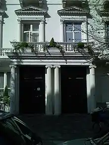 Leinster Terrace's east side is Craven Hill Gardens and Lancaster Gate with one exception, its first numbers. These are today in its centre, 16, 17 and 17A: one of which is a listed public house, the Leinster Arms.[4] The street starts opposite Hyde Park with the side elevations of Porchester Lodge/Lancaster Corner (synonym: 100-101 Bayswater Road) which is listed in the middle category (Grade II*) and is marked with a blue plaque to once long-resident writer J. M. Barrie (d. 1937) who wrote Peter Pan.[5][6] Adjacent, on the west side of the street, is Hyde Park Towers, an eight-storey, dark-brick, Art Deco-inspired block with hexagonal and lozenge projections. This is behind a narrow band of trees, shrubs and railings. Beyond this are shophouses of yellow-brown then yellow brickwork with a crowning cornice (ledge), other white dressings and sash windows (19-34 consecutive), many of which face the main front of Corringham, an architecturally listed, glass-heavy residential block officially in Craven Hill Gardens, designed by Kenneth Frampton (born 1930, in later life, Ware Professor of Architecture at Columbia University), behind which is a private garden.[7][8] These shophouses are flanked by one-storey restaurants (nos. 18 and 35). A broad alley marks the end of the Leinster Terrace section of the street.