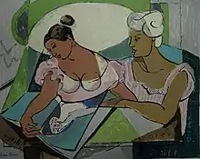 In the Spring of 1945 the A.C.A. Gallery gave Gurr her third solo exhibition.[49] Reviewing this show, Melville Upton, critic for the New York Sun, saw a steady advance in her painting, noting a pleasing "structure of repeating and contrasting forms" in one picture and a "complicated and fanciful" design in another.[50] In the New York Times, Howard Devree discussed her talent for depicting her subjects feelingly, using as her themes "human relationships and the joys and sorrows of everyday life."[51] Peggy O'Reilly, of the Brooklyn Eagle, quoted Gurr as saying that while her aims were primarily aesthetic, she tried to be "a creature of what's around me." Regarding a painting called Indestructible, Gurr said she "tried to show that no matter how much the world is ravaged, love and art still remain."[49] The Brooklyn Eagle's other critic, A.Z. Kruse, also reviewed this solo exhibition. Saying that Gurr "painted with the gusto of a Goya," he praised her "ability to record the emotional impact of an inspired moment" and noted that she held a secure place" in the "front ranks of outstanding American women painters."[2]