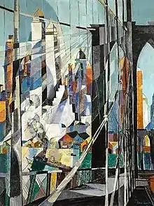 Two critics prepared lengthy reviews of a 1938–39 solo exhibition at the A.C.A. Gallery.[45][48][note 12] Writing in December 1938, the New York Post's Jerome Klein praised Gurr's successful handling of varied subjects (local urban settings, countryside vacations, terror in distant lands)[48] and in January 1939 Howard Devree noted her "capacity for transmuting homely scenes and incidents of every day life into pictures tinged with a kind of romantic realism and with quiet humor."[45][note 13] The page on which Devree's review appeared was illustrated by a painting of Gurr's called On the Bridge which was on view in the show.