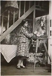 During her artistic career, Gurr mostly made easel art in oil and casein and also lithographic and silkscreen prints and some watercolors and drawings.[11] Her subjects included still lifes, city scenes, vacation settings, and depictions of war and persecution.[48] Over the years her technique evolved from representative and semi-abstract toward a more abstract semi-cubist style.[4][70][71] Many of her pictures were light-hearted and showed, in the words of one critic, a "quiet humor,"[70][72] while others displayed what another critic called "a ready sympathy" for slum-dwellers and "war-stricken humble folk."[48][70][note 20]