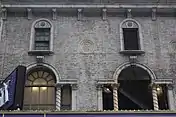 The central section contains three Palladian window frames at the second floor, with bracket-shaped keystones above each window. Twisting colonettes divide the openings in each Palladian frame, while the outer sections of the windows are bordered by pilasters with Corinthian-style capitals.[14][17] The center opening is an open-air loggia, behind which is a fire stair with an iron railing. The other two Palladian openings contain sash windows. At the third story, there are three openings, surrounded by twisting moldings and a terracotta frame. The center opening is a ventilation grate while the other two contain six-over-six sash windows. All three window openings have a lunette with rosette above them. Between the window openings are medallions that depict lyres. A sign with the name "Brooks Atkinson" projects from the western side of the third floor.[17] Brackets run above the third floor, supporting a cornice and a Spanish tile roof.[14][17]