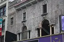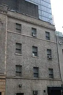 The Lena Horne Theatre's stage house is much simpler in design, with a terrazzo water table. Unlike in the auditorium section, all four stories are faced in brick. At ground level, there is a doorway and a garage opening, between which are two bricked-up window openings. A string course runs above the ground story. On each of the second through fourth floors, there are three sash windows with two-over-two panes, and a brick lintel is placed above each window. The stage house is topped by a cornice and a parapet.[16]